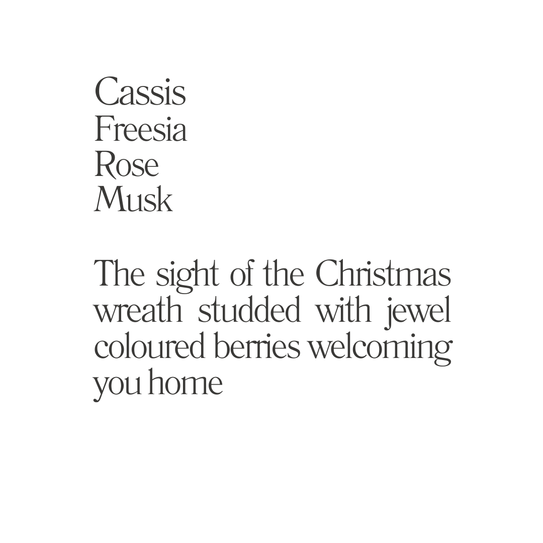 The sight of the Christmas wreath studded with jewel coloured berries welcoming you home. Cassis and rose are sweetened with musk for this sophisticated rich floral fragrance
